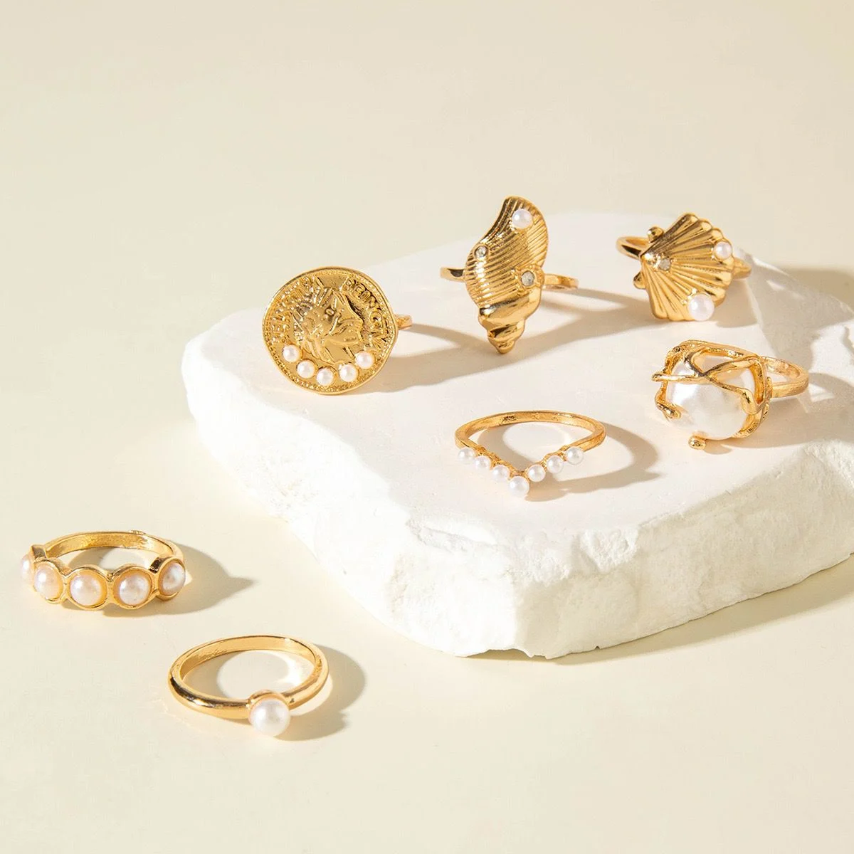 Dive into Style: Capture the essence of coastal elegance with this stunning 7-piece gold ring collection. Each piece is meticulously designed to celebrate unique textures and the classic beauty of pearls.