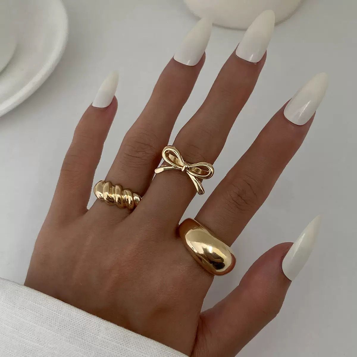 • Set Includes: One (1) Twisted Croissant Ring, One (1) Chunky Dome Ring, and One (1) Statement Bow Ring.